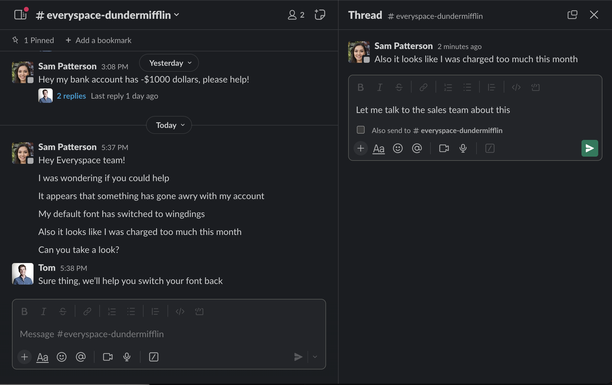 - If you have a conversation happening on the top level, you can thread off of a message to automatically split and create a new conversation out of that thread