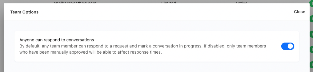From your “People” tab in your Unthread dashboard, you’ll see a column titled “Can Respond to Tickets”. If set to “yes”, then they can be assigned new conversations and mark them as in progress when they respond to a customer. You can override this setting by clicking on the user name and going to their profile. By default, all team members are eligible to respond to customer conversations, but you can also manage the default by clicking the “Options” button in the team tab.