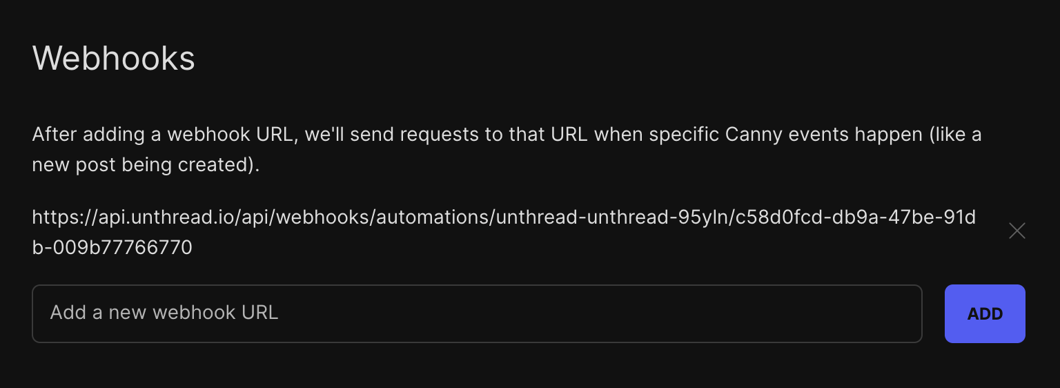 To get updates from Canny back into Unthread, you'll want to provide a webhook