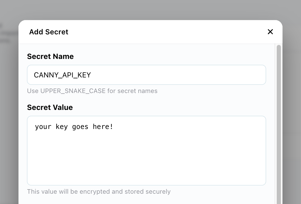 • In the pop-up modal, set the name CANNY_API_KEY, and paste the value into the box below