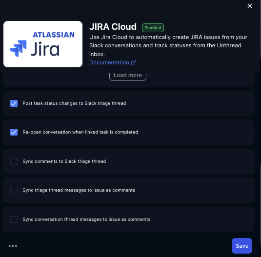 "sync comments to slack triage thread": When someone adds a comment on a linked Jira issue, that comment is automatically posted as a threaded reply in the Slack triage thread for the corresponding Unthread conversation"sync triage thread msgs to issue as comments":When someone posts a message in the Slack triage thread (the internal/agent-facing thread) for a conversation that has a linked Jira issue, that message is pushed to the Jira issue as a comment."sync convo thread msgs to issue as comments": When messages are added to the main conversation thread (the customer-facing thread, not just triage), those messages are pushed to the linked Jira issue as comments.