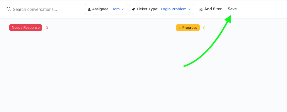 From the web dashboard, you can filter for specific messages by customer, status, assignee, and more. You’ll see a “Save…” button that allows you to save this as a custom filter that will appear in your left navigation bar for easy access. How to save a filter: